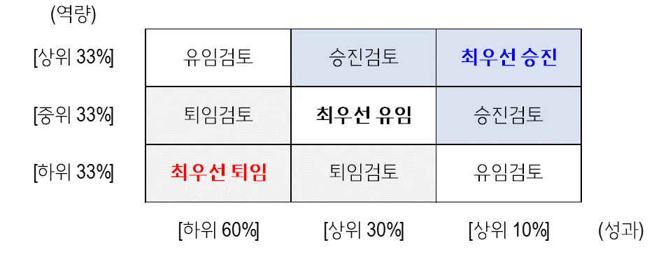평가제도 및 리더십 진단 결과는 연말 임원 인사 시, 9-Matrix의 구성항목(성과 / 역량)으로 활용되어